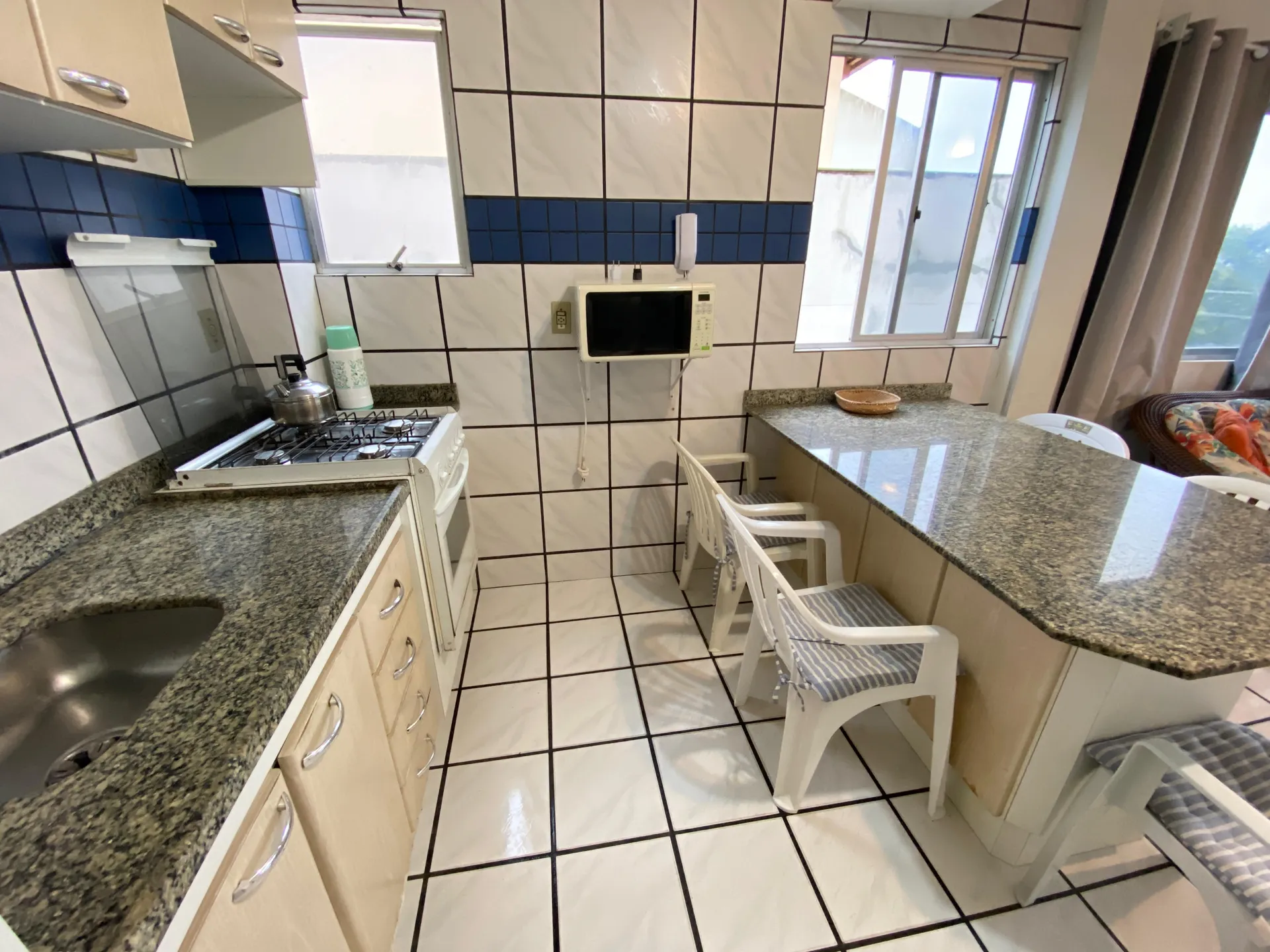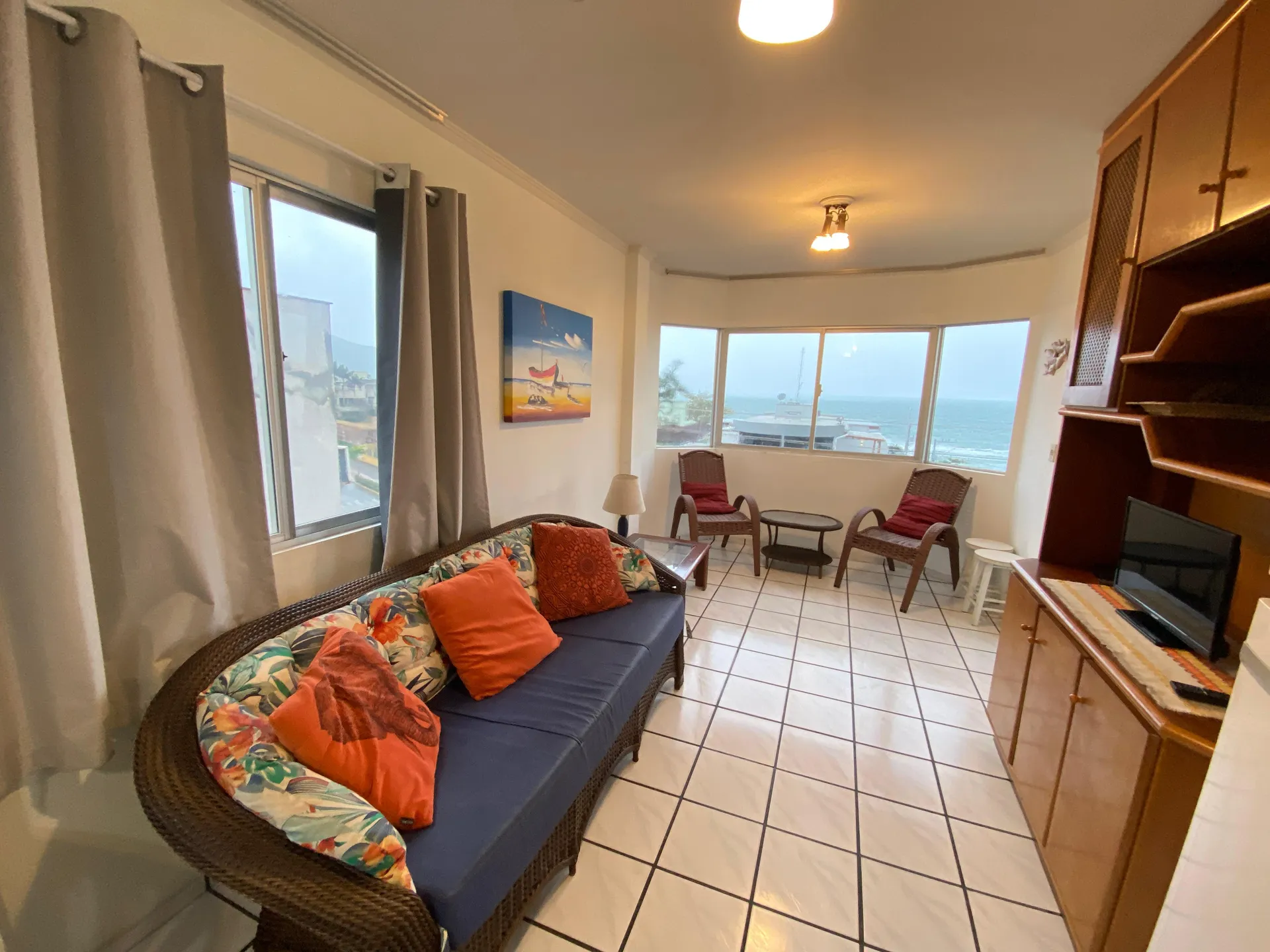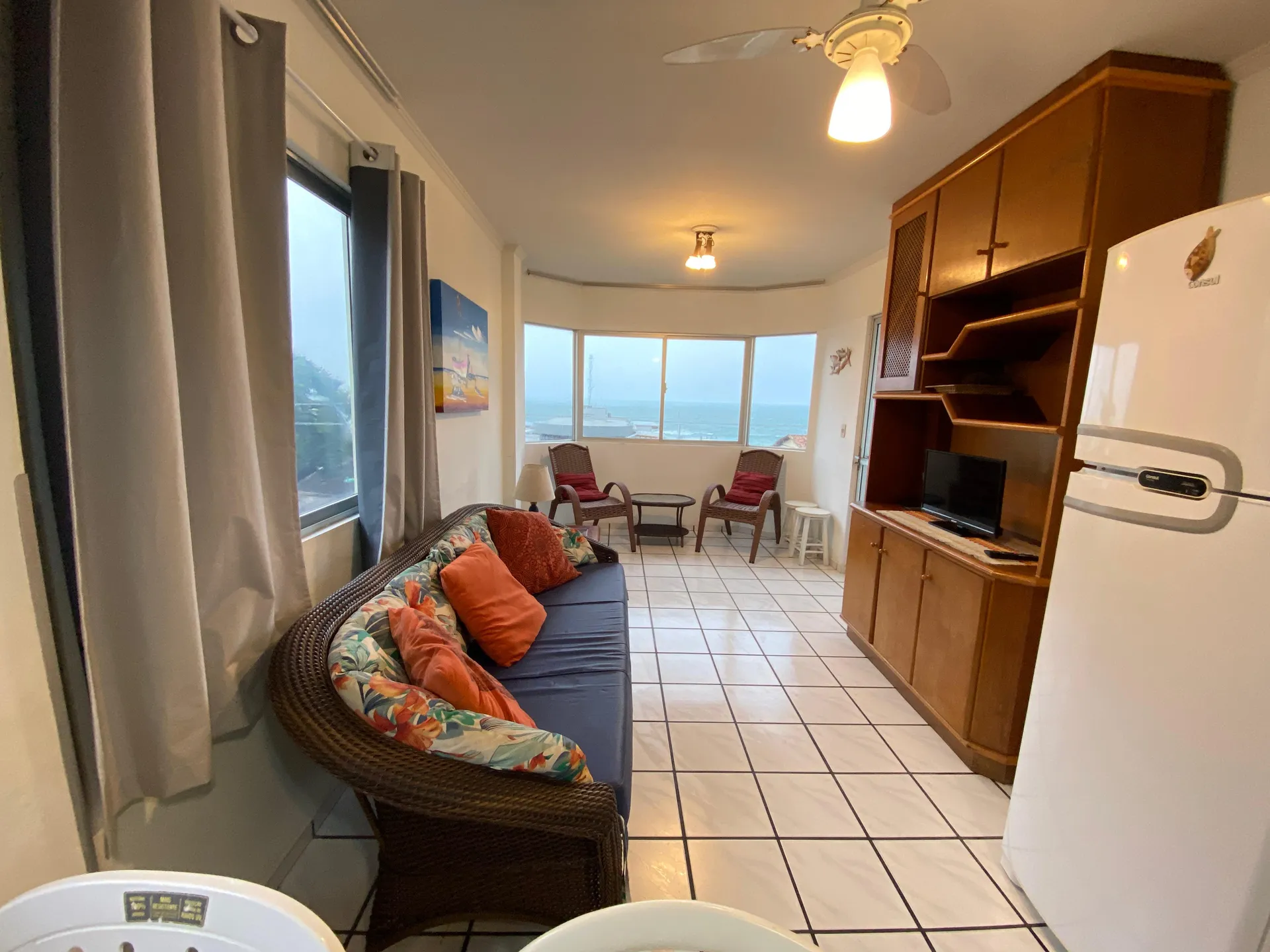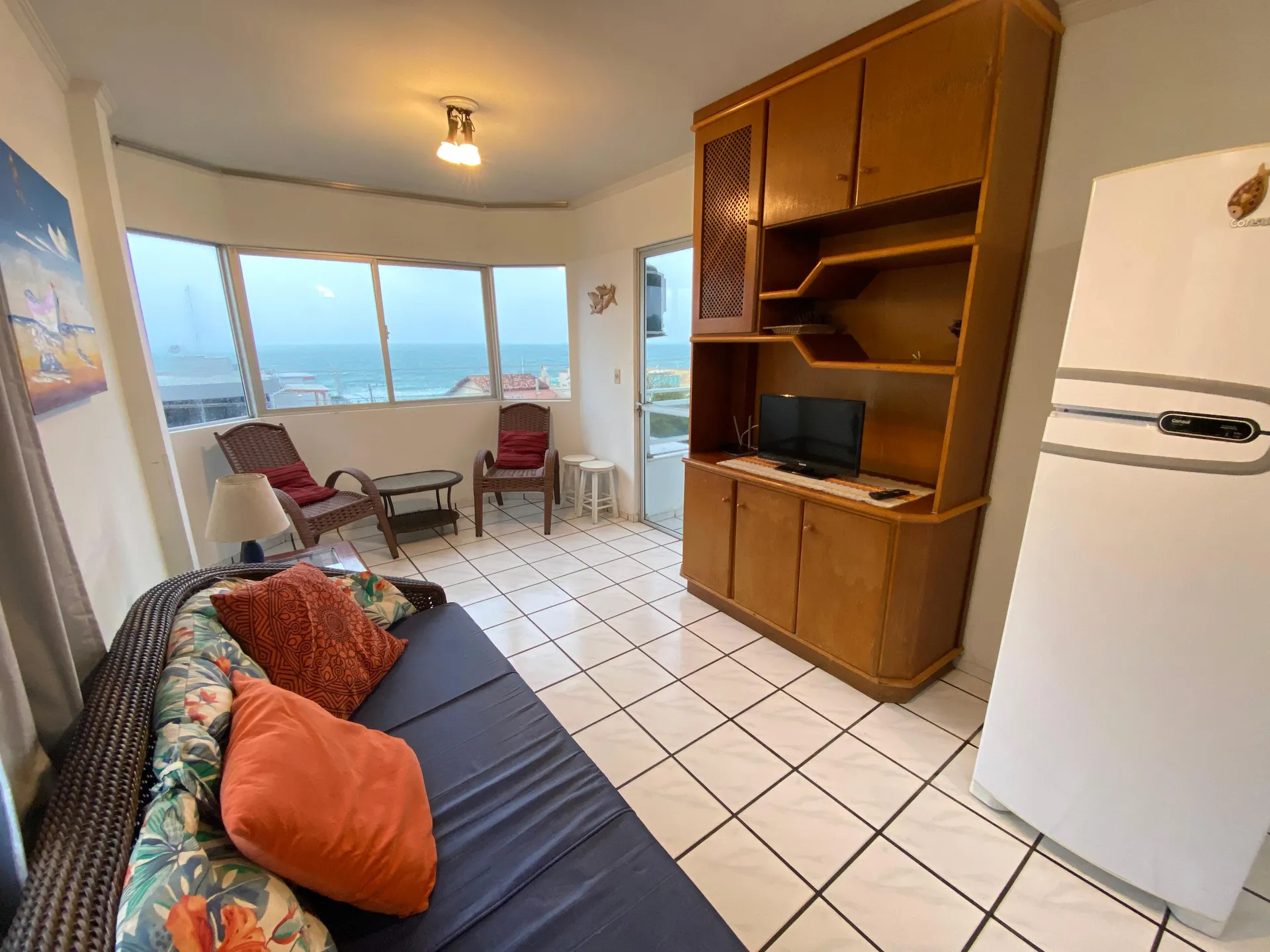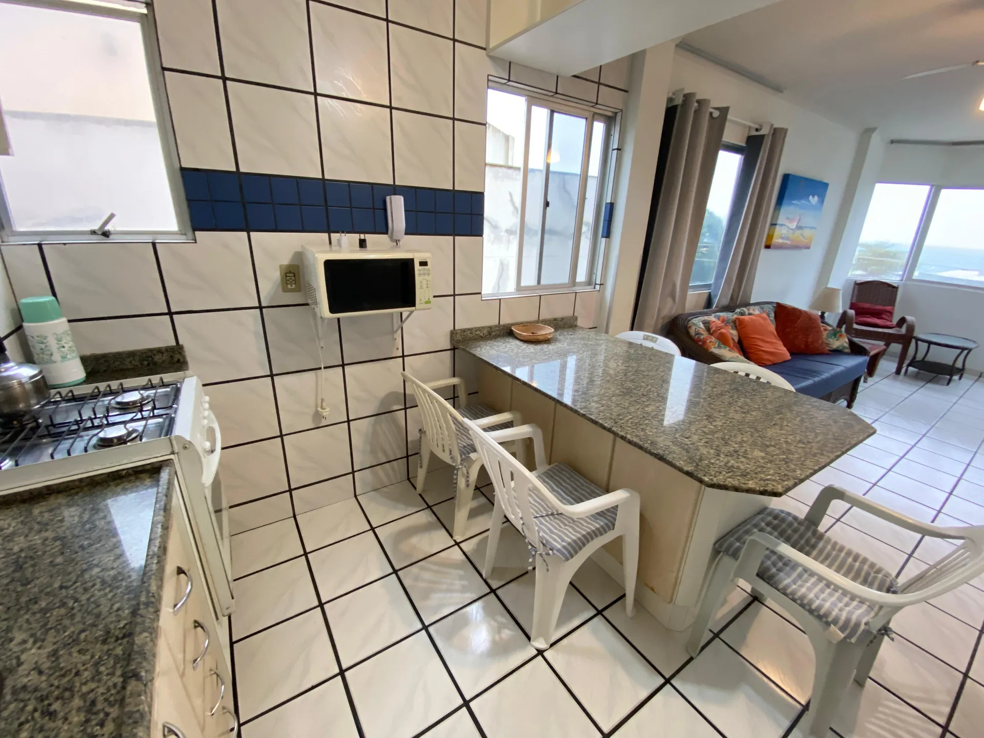 Sacada com churrasqueira e vista ao mar,
