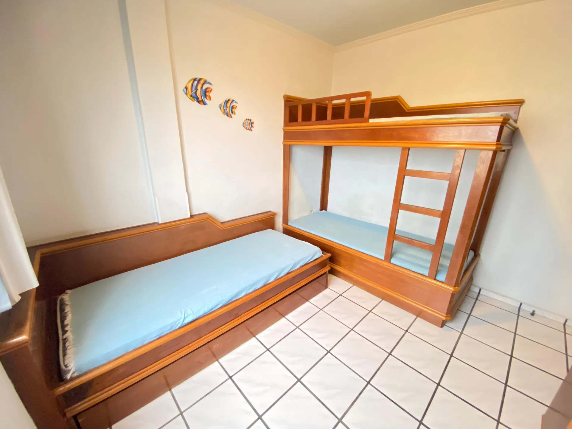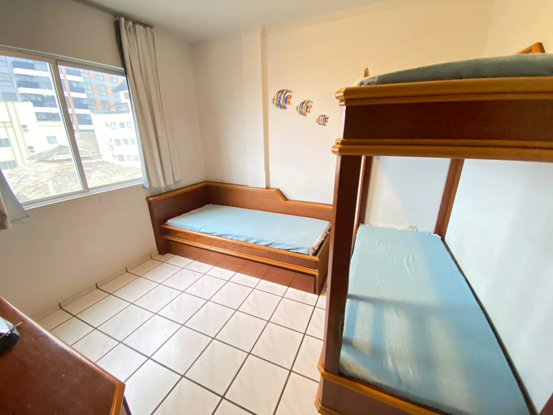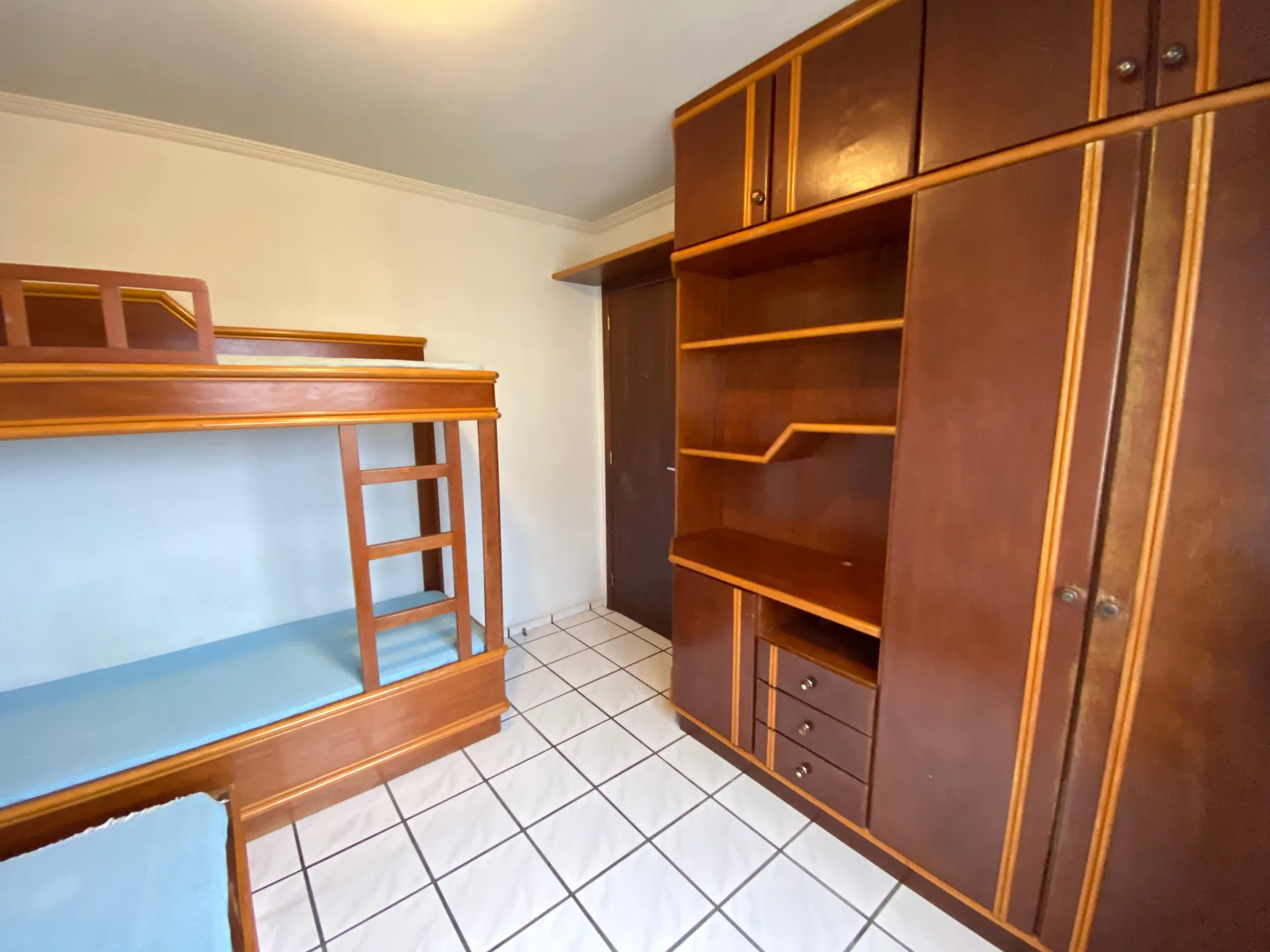 01 dormitório de solteiro com 1 beliche e 1 cama de solteiro com mais 1 auxiliar, apenas ventilador portátil.